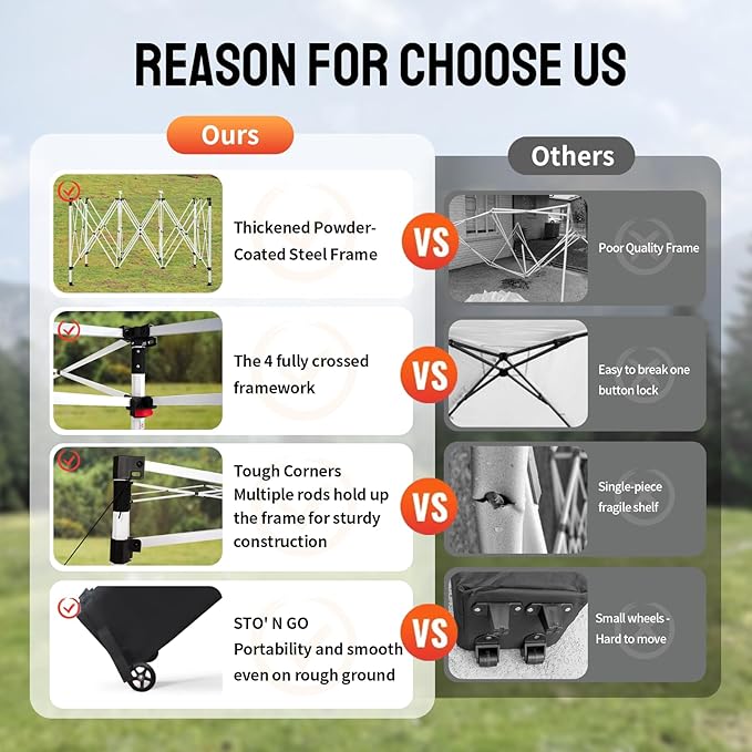 - QUICK POP-UP INSTALLATION: The outdoor pop-up canopy can be deployed in under five minutes. Simply extend the frame, secure the top cover of your easy-up canopy tent, adjust the height as necessary, and finalize the setup with stakes and ropes.