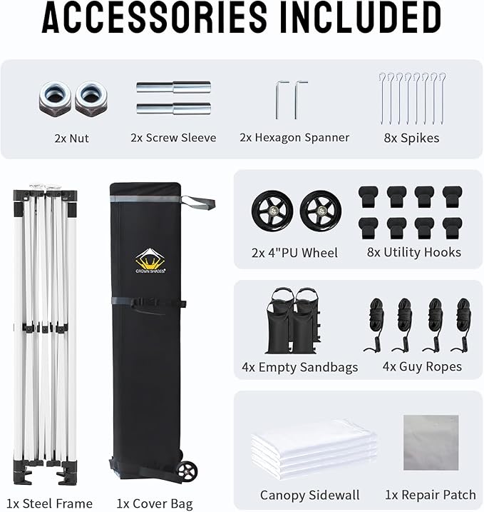 - CONVENIENT ROLLER BAG: This 10x15 pop-up canopy comes with a bag that has 4-inch wheels for easy mobility, featuring a spacious opening and a sturdy pull handle. The convenient pocket design can store 4 stakes and 4 ropes, making this canopy an ideal choice for any outdoor event.