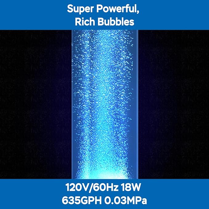 - PERFORMANCE - This pond aerator delivers oxygenation with its 18W full copper coil motor, producing a Max 635GPH (40LPM) airflow at 0.03MPa pressure. The heavy-duty construction ensures maximum efficiency with minimal power consumption.