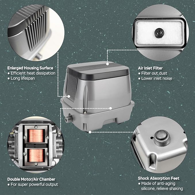 - IMPROVED HEAT DISSIPATION - The enlarged housing surface provides superior heat dissipation, keeping the pond air pump running stably. Perfect for continuous 24/7 operation in ponds, hydroponic air pump systems, or wastewater treatment.
